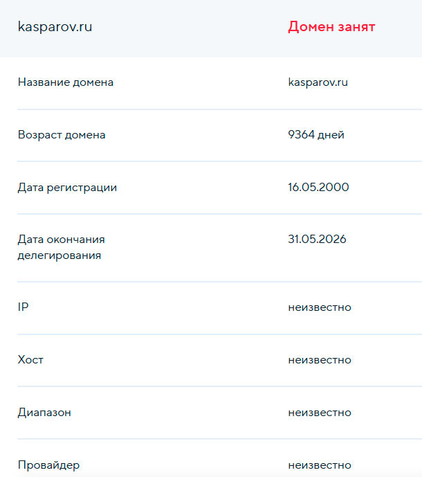 А «оппозиционный» сайт «Каспаров РУ», похоже, потерял кремлёвское финансирование. И его просто прихлопнули, без шума и пыли. Делегирование домена ещё не закончилось, оно продлено до мая текущего года включительно, но… смотрите на скрин из WhoIs: