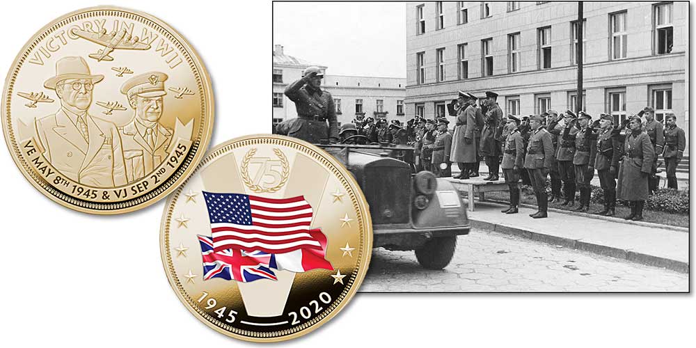 «После четырех долгих лет войны и жертв союзники наконец одержали победу. Величайшему поколению настало время торжествовать и размышлять о потерях и приобретениях этой войны, а также о светлом свободном будущем, лежащим впереди. Теперь вспомните обо всех тех, кто защитил нашу нынешнюю свободу, с нашей юбилейной монетой 75-летия победы во Второй мировой войне. На аверсе изображены флаги наций-союзников: Соединенных Штатов, Великобритании и Франции, а также даты годовщины», – говорится в описании под товаром.