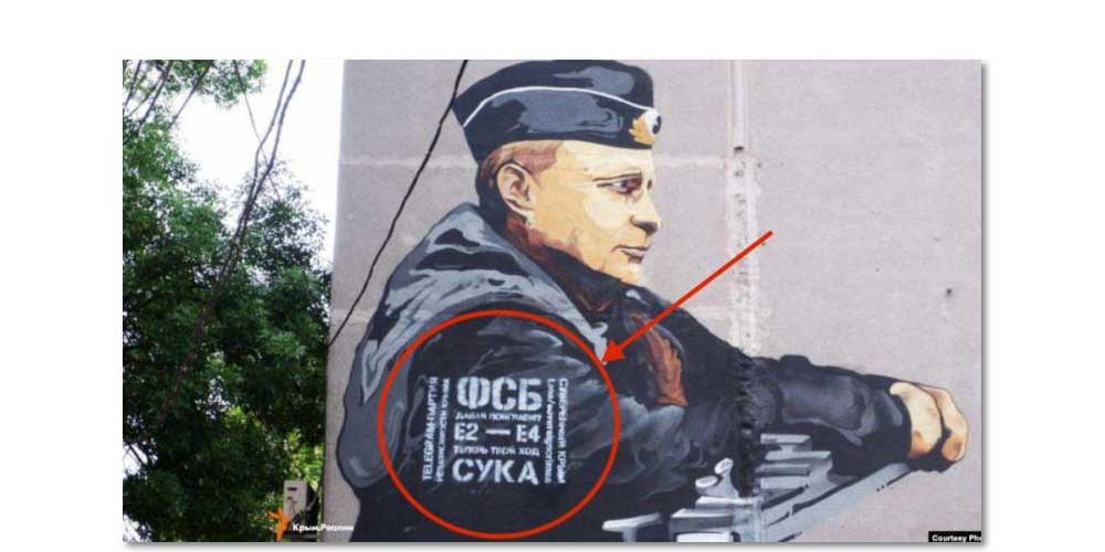 Возражаю насчёт «на ушах». Эта надпись – дело рук именно ФСБ. Причём ослиные уши ФСБ торчат уже из высокого качества исполнения этой надписи – подумайте сами! Это работает принцип ещё царской охранки: не можешь уничтожить – возглавь. Так выявляют (или намерены выявлять) носителей проукраинских настроений среди населения Крыма — Ремарки «Слова»