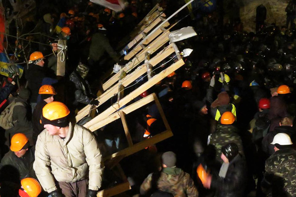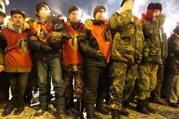 Майдан уже не напоминает игры в «Зарницу». Вместо снесенных игрушечных баррикад построены настоящие крепостные стены — из мешков со снегом, политых водой и армированных сваренной арматурой — весь день позавчера варили, — тросами, колючей проволокой, ежами, бочками, металлическими щитами и вообще всем, что подвернулось под руку. Непонимание того, что и как надо делать и зачем мы вообще здесь собрались, ушло, и служба налажена четко и ровно, со сменами, взводами, сотнями, распределением обязанностей, секторами наблюдения, постами, должностями и пропускным режимом. Службу на постах несут ветераны Афганистана, которых теперь шестьсот человек. Для отражения атаки заготовлены фанерные щиты — прям совсем как мы в детстве делали, когда играли в рыцарей. Улицы перегорожены ежами. Все стало серьезно. Янукович разворошил этот муравейник и, разворошив, разозлил его. Люди веселы, злы, подготовились, и они ждут.