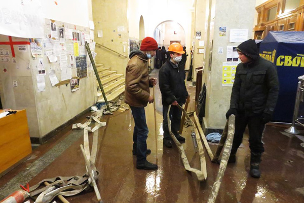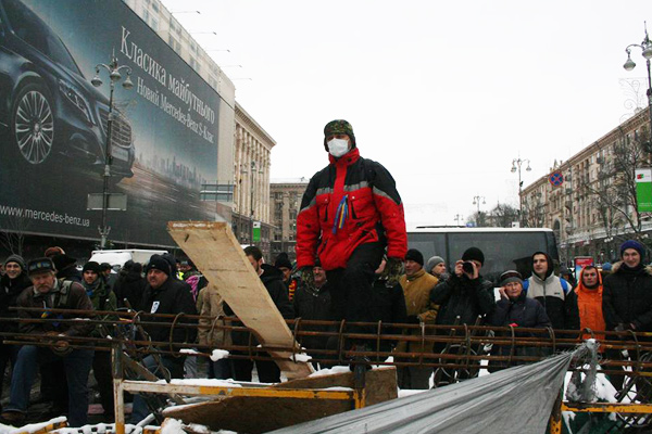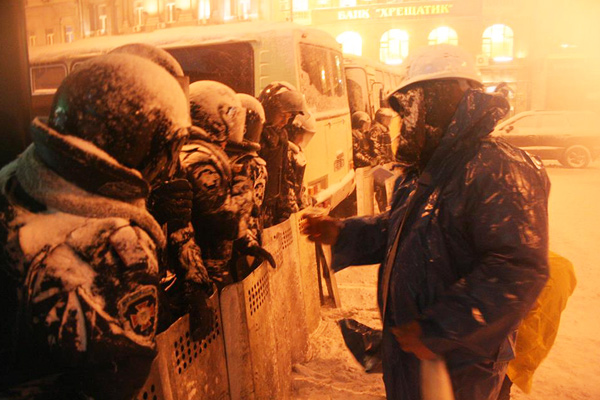 Майдан растет с каждым днем. Меняется с каждым часом. Каждый раз, выходя на мониторинг ситуации, я не узнаю тех мест, где проходил еще пару часов назад. Из палаток выстроили уже целые улицы, и я начинаю путаться в них, не в состоянии отыскать знакомый путь к гостинице. Фортификации укрепляются постоянно, и постоянно находятся какие-то новые инженерные решения. Из последнего — обмотанные колючей проволокой ежи и расстеленная на нейтралке широкой полосой все та же колючая проволока. Люди постоянно прибывают. Население лагеря растет. Обжитый и уже установивший свою логику быт раскачался и вошел в оптимальный режим работы. Каждый знает свое место, каждый выполняет свои обязанности. Одни таскают дрова, другие разносят чай и бутерброды, третьи их готовят, четвертые варят суп, бигус, кашу и гуляш — на всех, пятые дежурят на баррикадах, шестые их строят, седьмые в отрядах самообороны, восьмые устанавливают платки, девятые убирают мусор, десятые, пятнадцатые, двадцатые… Поразительно, но выпавший и утрамбовавшийся снег был убран с площади всего за одну ночь — при помощи всего лишь палок и молотков. Убран, расфасован по мешкам и сложен в баррикады.