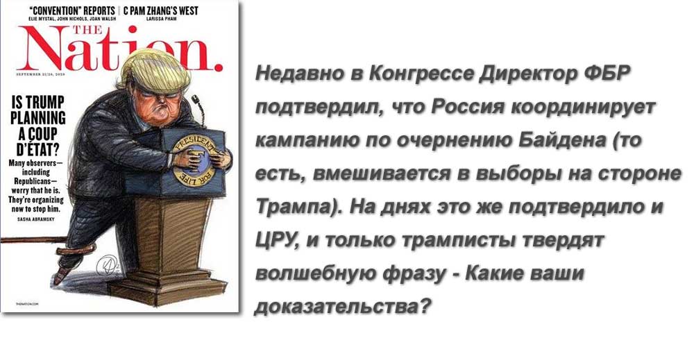 Недавно в Конгрессе Директор ФБР подтвердил, что Россия координирует кампанию по очернению Байдена (то есть вмешивается в выборы на стороне Трампа). На днях это же подтвердило и ЦРУ и только трамписты твердят волшебную фразу — Какие ваши доказательства?