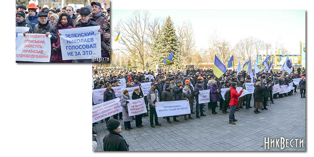 Работники завода вышли на митинг с плакатами: «Зеленский, Николаев голосовал не за это», «Отдельно каждый из нас капля, вместе мы — «Океан», «Руки прочь от «Океана», «Власть, не мешай корабелам работать».